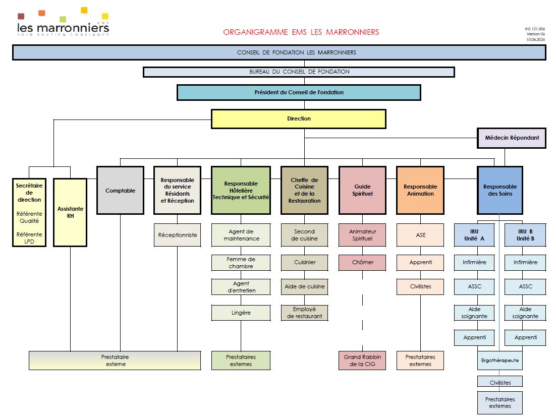 - La Direction de l’EMS Les Marronniers s’engage à mettre en œuvre une démarche de management intégré tenant compte des aspects humains, des exigences politiques et environnementales dans un contexte qui s’appuie sur une amélioration continue afin de satisfaire les attentes des Résidants, des familles et des parties prenantes.